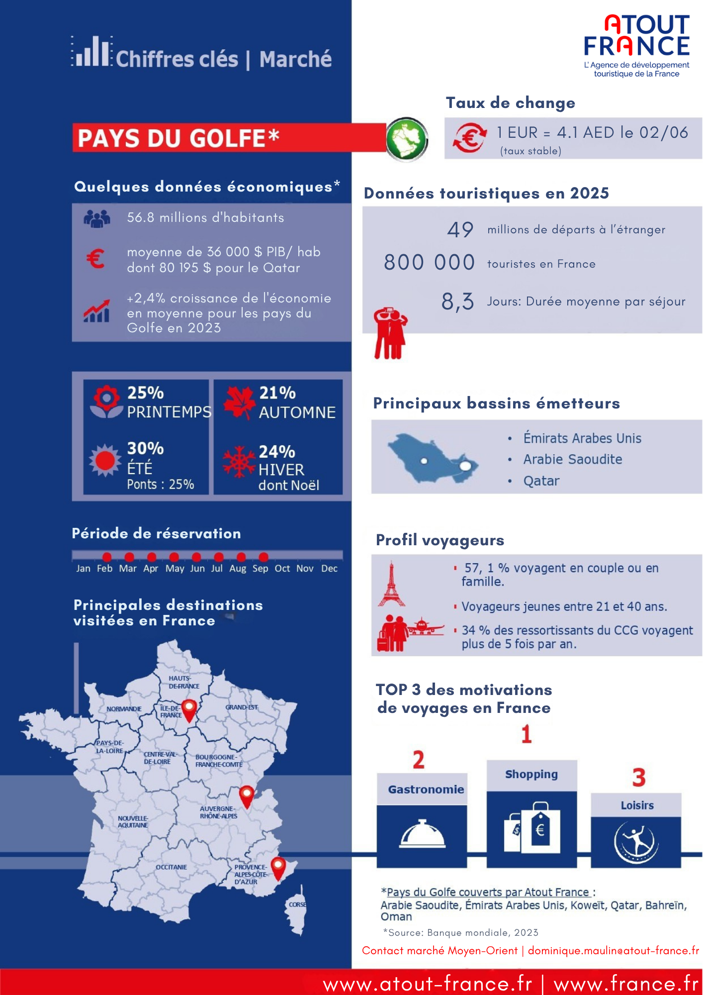 La clientèle du Golfe représente à elle-seule 75% de la dépense des voyageurs du Moyen-Orient. Attentifs à la qualité et au service, les voyageurs du Golfe sont à la recherche du luxe, avec des séjours personnalisés.