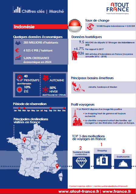 Durant la période pré-COVID (2016-2018), l’Indonésie représentait en moyenne 126 000 arrivées en France chaque année, pour une durée moyenne de séjour assez courte, de l’ordre de 6 nuitées pour toutes les destinations à l'international*.