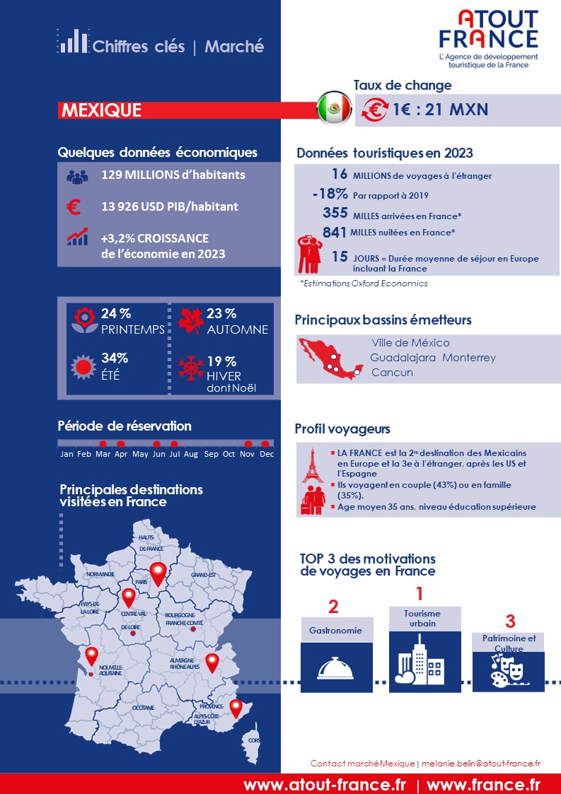Les voyageurs mexicains sont résilients et s'adaptent au contexte dans lequel ils vivent. On observe une constante augmentation des séjours, avec une durée plus longue et une plus grande diversité de destinations visitées dans le pays. Toutefois la France est fortement concurrencée par l'Espagne qui bénéficie d'une connectivité aérienne directe plus importante avec le Mexique.