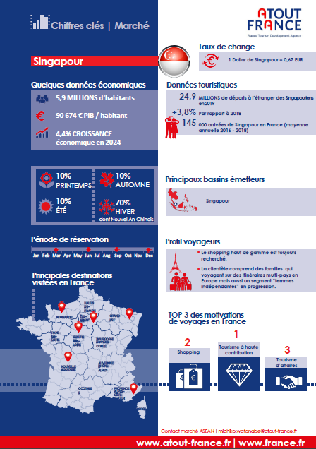 Durant la période pré-COVID, entre 2016 et 2018, le marché singapourien représentait en moyenne 145 000 arrivées en France, pour une durée de séjour moyenne parmi les plus longues des marchés ASEAN (env. 9 nuitées), vers l'ensemble des destinations à l'international**.